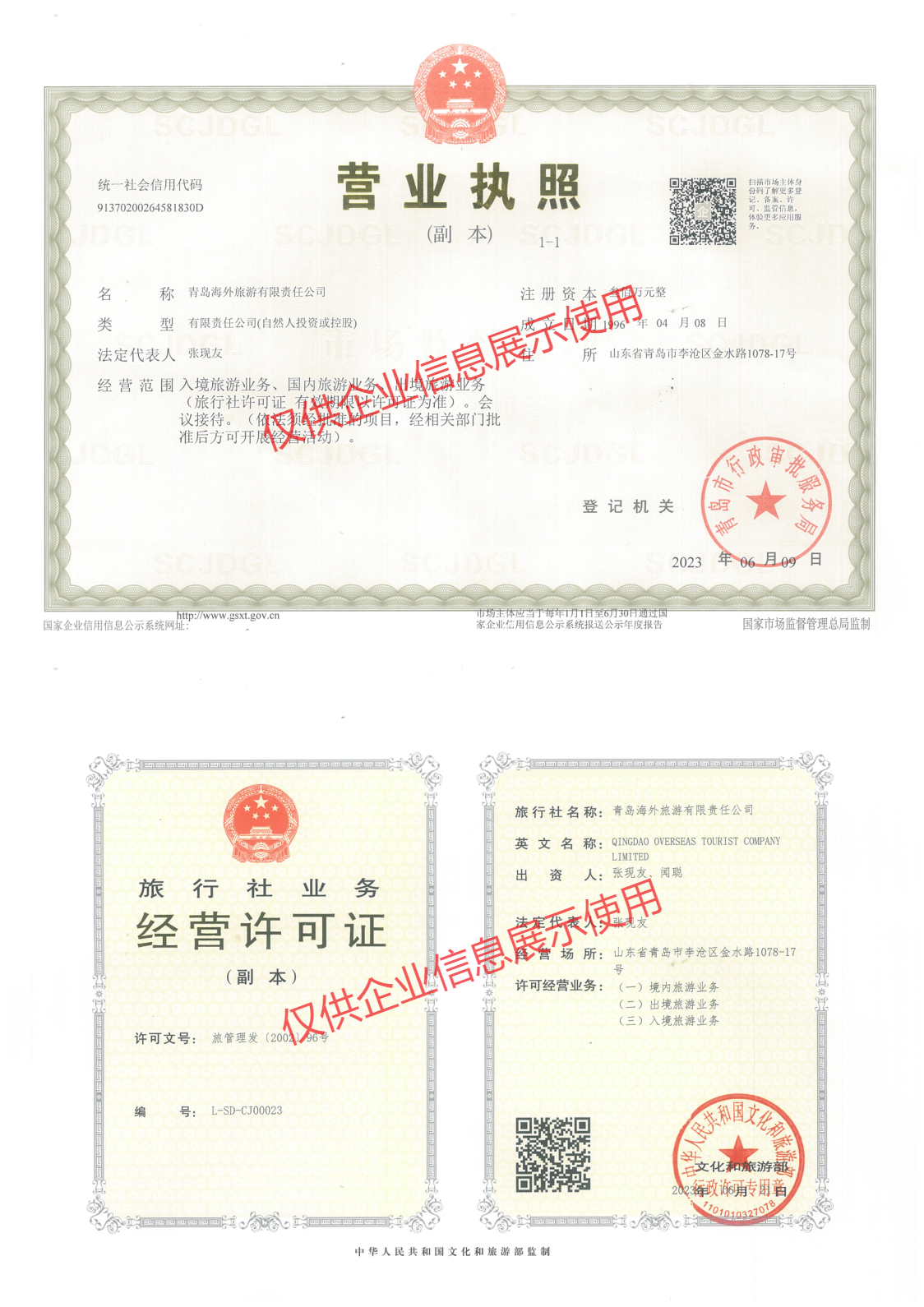 青岛海外旅游运营证照展示