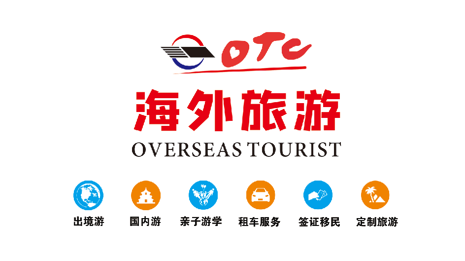辅助色:沉稳黑用于英文标识 “OVERSEAS TOURIST”,凸显品牌的专业与厚重;活力橙则点缀在业务图标(国内游、租车服务等)中,既区分业务模块,也增添了旅行的轻松与愉悦感。